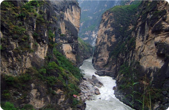 在云南省麗江納西族自治縣石鼓東北。長江上游金沙江到此急轉(zhuǎn)北流。峽谷長16公里,右岸玉龍雪山主峰海拔5,596米,左岸中甸雪山海拔5,396米,中間江流寬僅30~60公尺。虎跳峽的上峽口海拔1,800公尺,下峽口海拔1,630公尺,兩岸山嶺和江面相差2,500~3,000公尺,谷坡陡峭,蔚為壯觀。江流在峽內(nèi)連續(xù)下跌7個(gè)陡坎,落差170公尺,水勢洶涌,聲聞數(shù)里。當(dāng)年堯茂書的探險(xiǎn)隊(duì)就曾經(jīng)在此漂流,雖英雄壯志未酬身先去,此地卻因此而名聲大振。